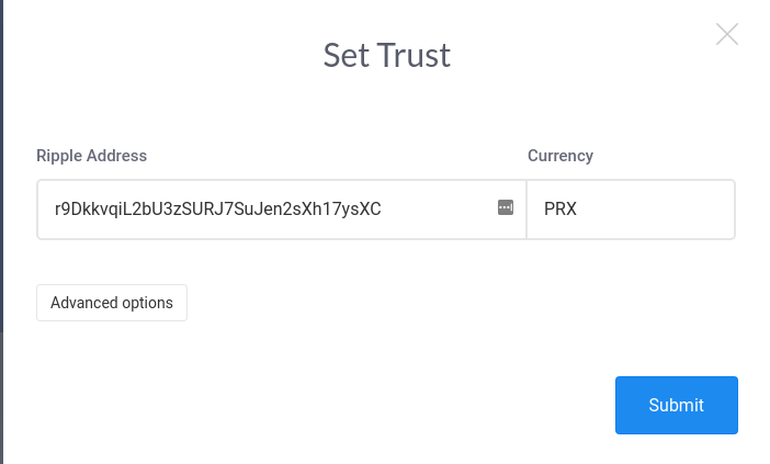 This is an important step. Unless you set the trust line accepting PRX you cannot be sent it! If you do not set a trust line accepting PRX you will not be able to receive PRX.