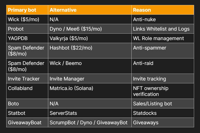 Here is my old list of recommended bots: https://twitter.com/Jon_HQ/status/1504575074396884993โฆ Generally this still applies, with the critical exception of a bot to delete webhooks as they are created. (Server Supervisor) Setting up these bots securely is actually very difficult.