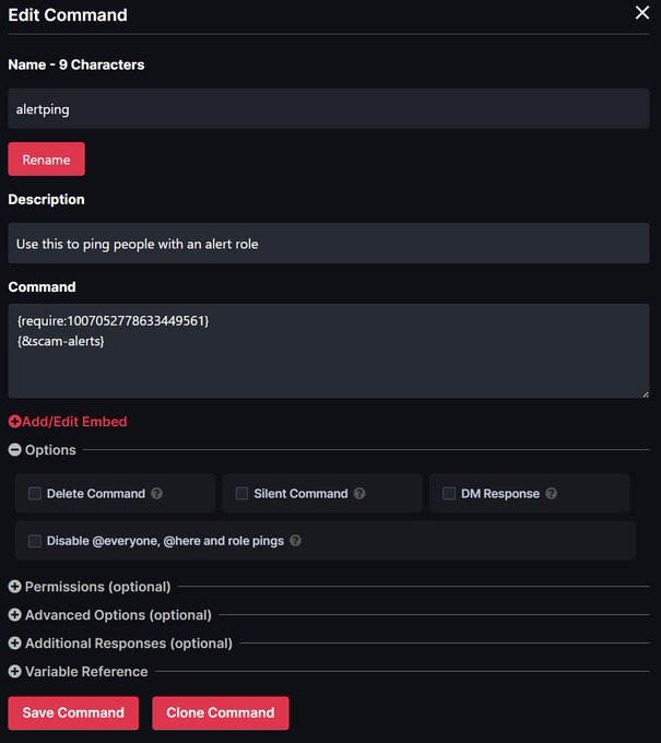 Mentioning other roles... This is where we can compromise - while we can't give mention everyone permissions to CMs... we can give them custom commands. This is how in Dyno you can make a command that only a certain role can use, which will ping the 'scam-alerts' role.