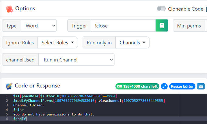 Toggling channels off and on... Sometimes there is a channel that is only relevant temporarily - this might be an AMA channel or a game channel. One route is to use your Announcement Account... the other, is... you guessed it, a custom command! Here it is in ccommandbot.