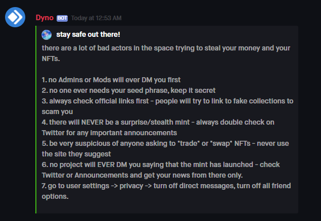 SpamDefender will ban any accounts joining your server with common phishing usernames and once set up properly, any accounts trying to impersonate your project or your team members. This is so important to have and protects newbies in the space.
