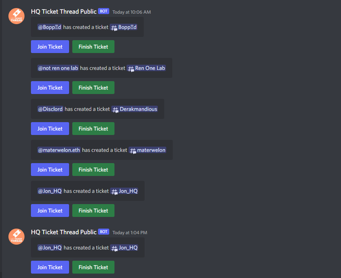 Sorry this took so long to get out but NFT NYC and Covid both interfered with the release time. I'm announcing a bot I developed with @cryptovega_ called Ticket Thread. It lets you open tickets in private threads. It is free and opensourced!