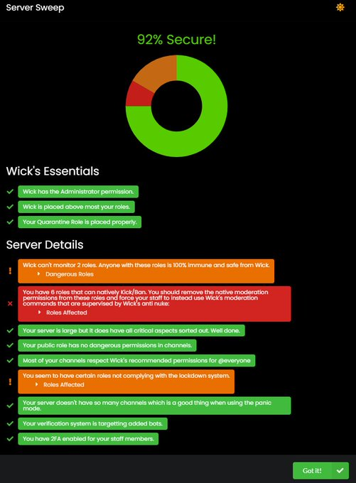 This is what a good server sweep result looks like: For this server, some bots have necessary native kick ban. Some bots had to live above Wick to delete webhooks. Some bots require perms that frustrate the lockdown system. Anything lower than 80% is usually pretty suspect.
